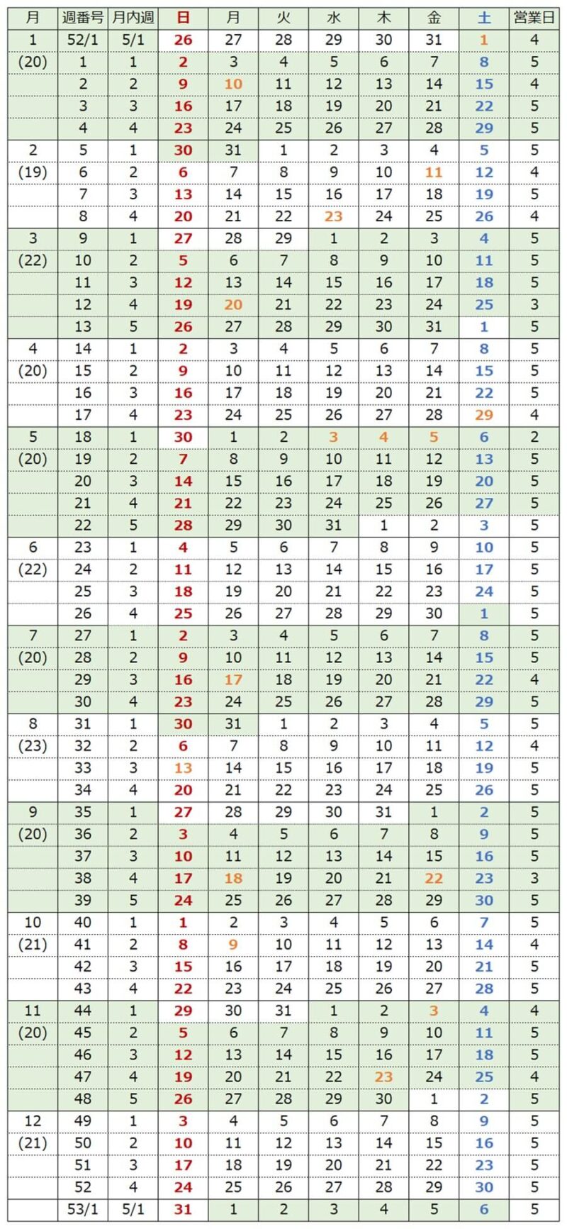 ・縦月数字下の(数字)はその月の土日祝日を除いた営業日